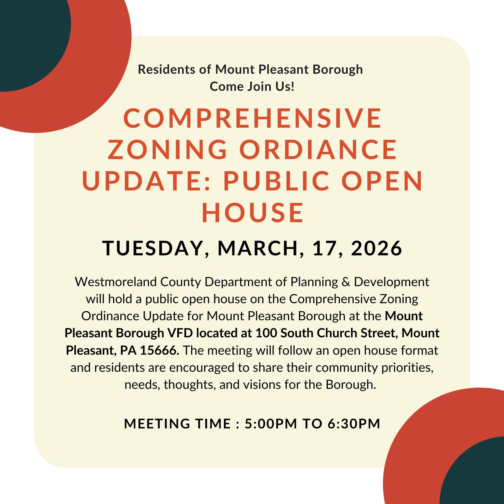TUESDAY, MARCH 17, 2026 FROM 5:00PM - 6:30PM at Mt Pleasant VFD at 100 South Church Street, Mount Pleasant