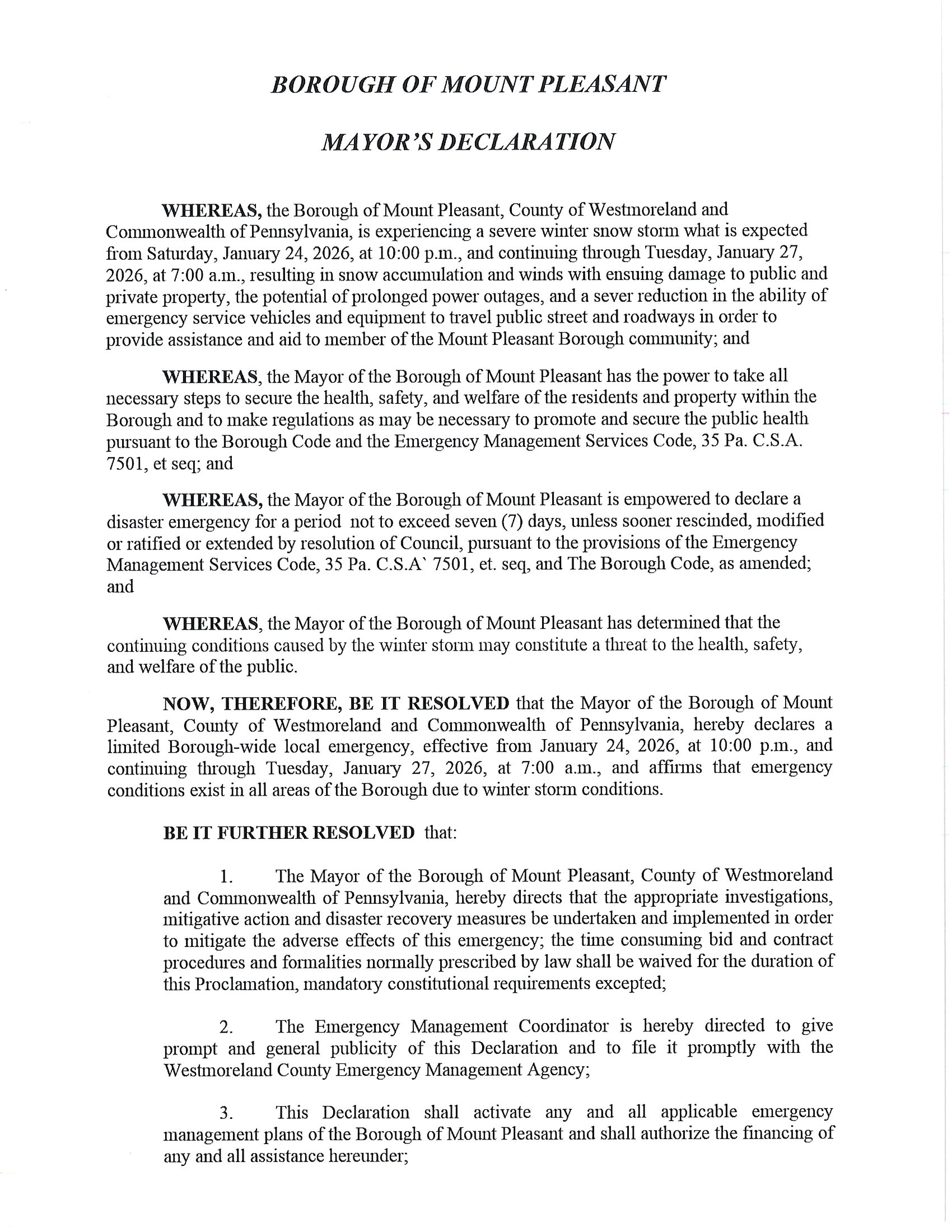 The Mayor of the Borough of Mount Pleasant has declared a State of Emergency for the Borough of Mount Pleasant.