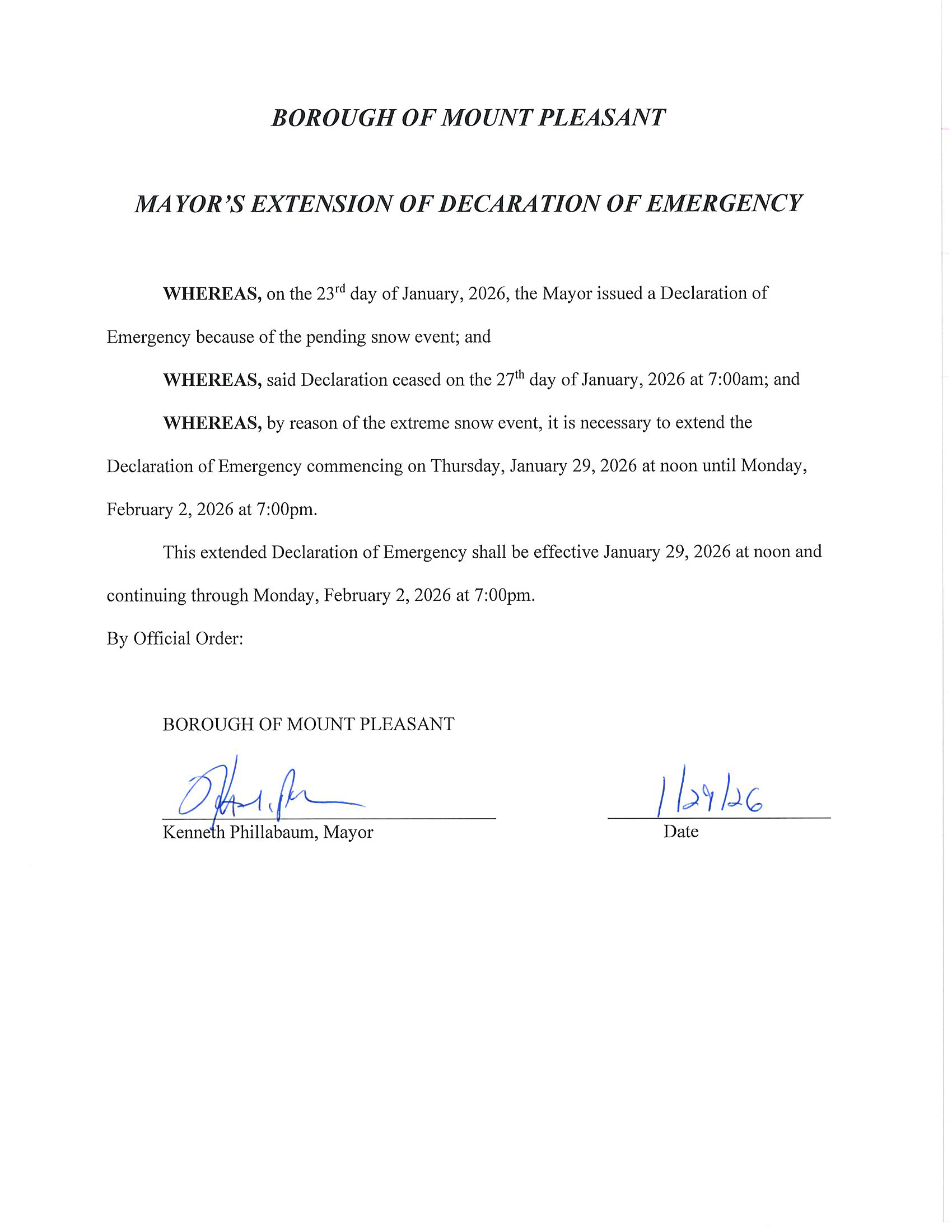 The Mayor of the Borough of Mount Pleasant has extended the Declaration of the State of Emergency for the Borough of Mount Pleasant